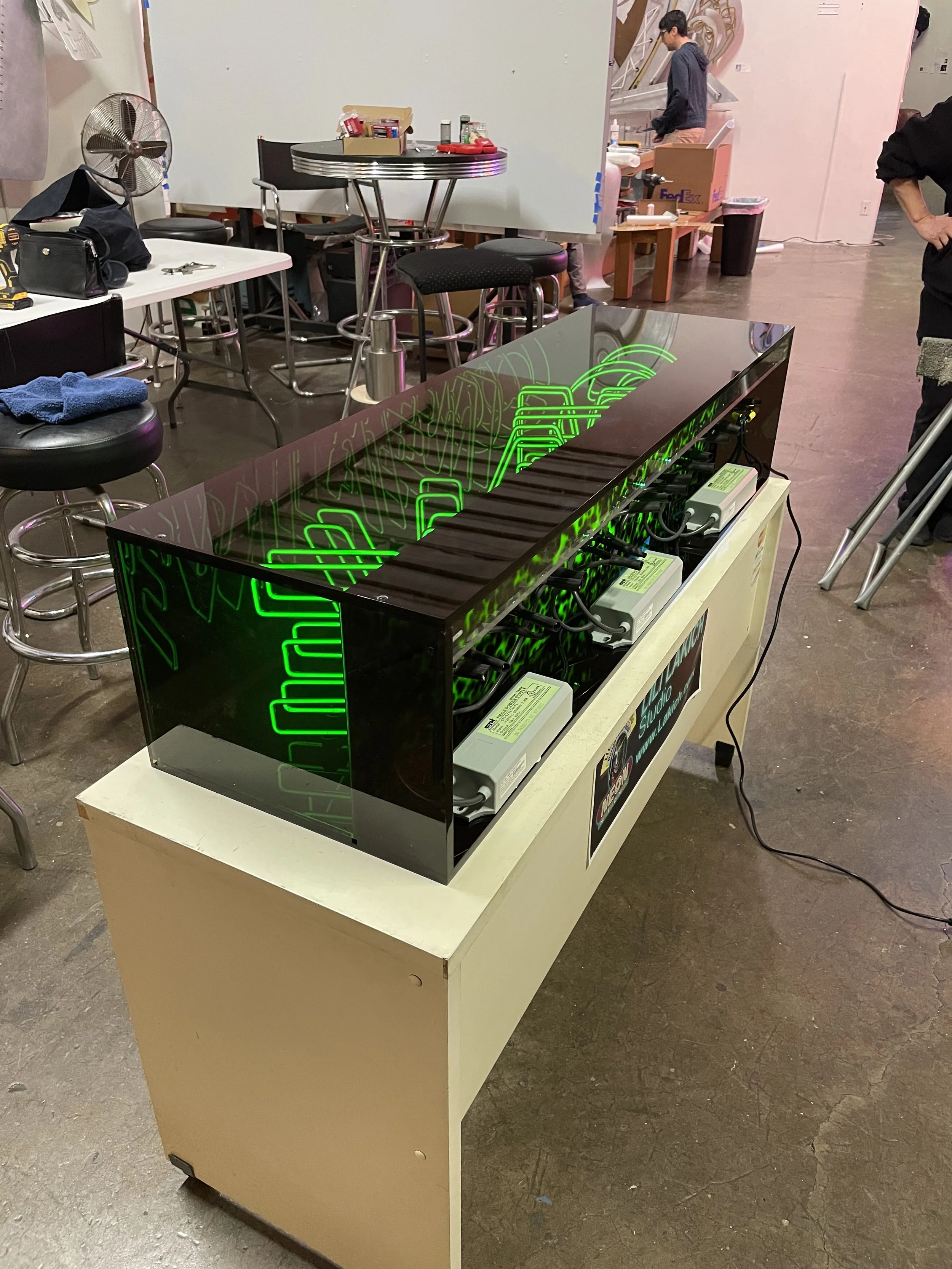 Nine letters—each hand formed from a single continuous piece of glass—are stacked at a deliberate angle, shifting the idea of a neon “sign” into dimensional form. 8mm emerald green neon, pumped with argon–mercury, emits a saturated, uncanny glow that feels alive.